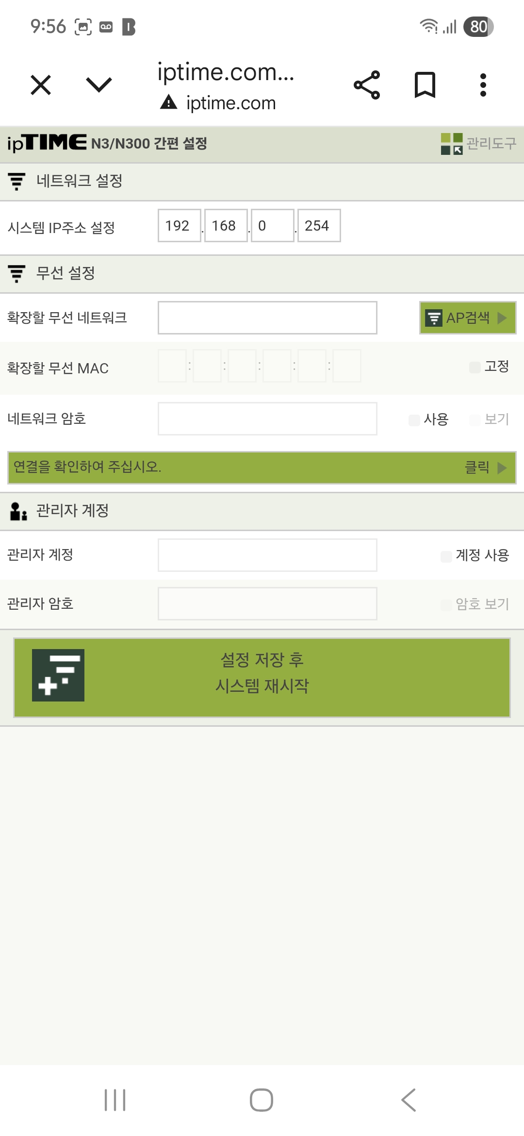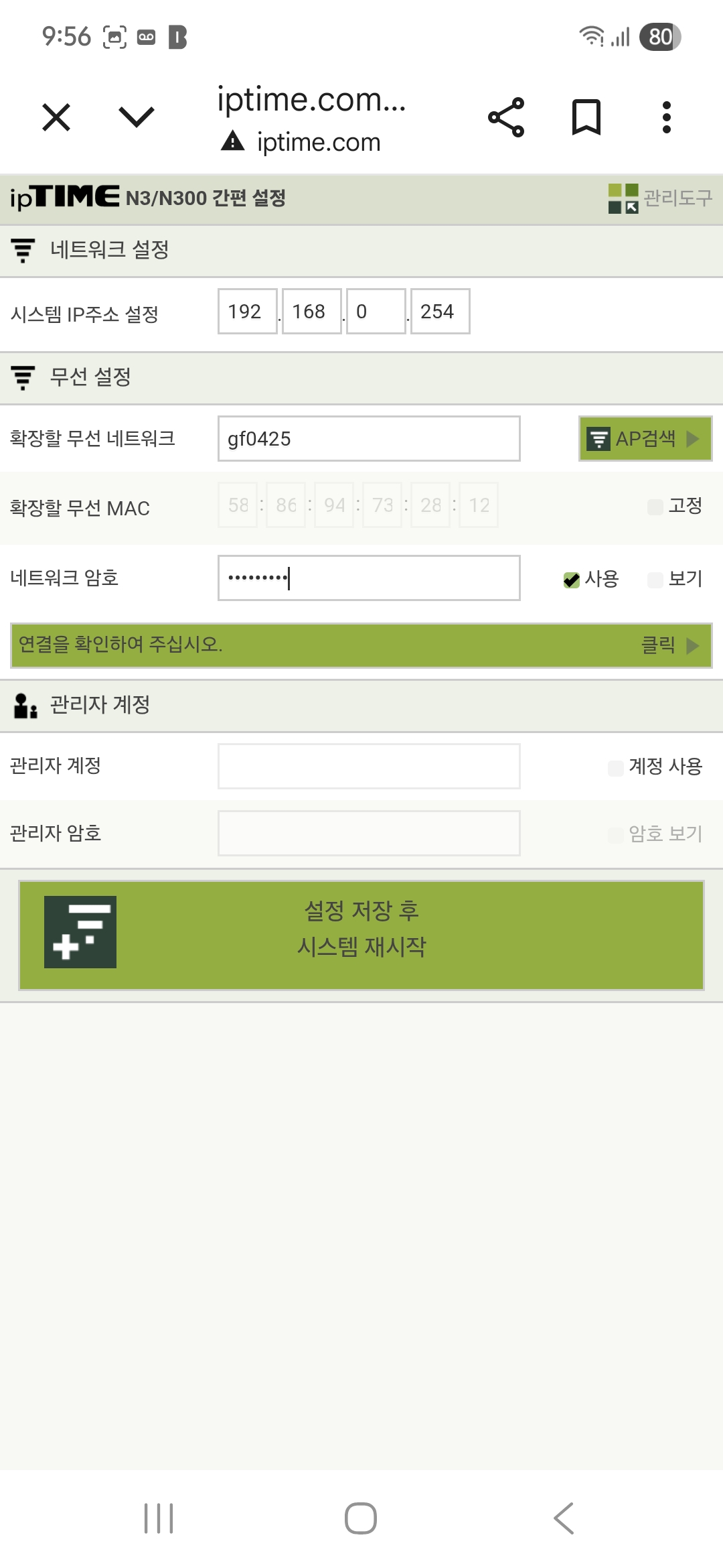 25.11.19오대표네 창고에 설치된 원거리 CCTV를 스마트폰으로 보기위해 집 인터넷을 무선으로 창고로 송신하고 창고의 익스텐더로 수신하기 위하여 무선공유기를 설정한다모델 : ipTIMD N604E유선공